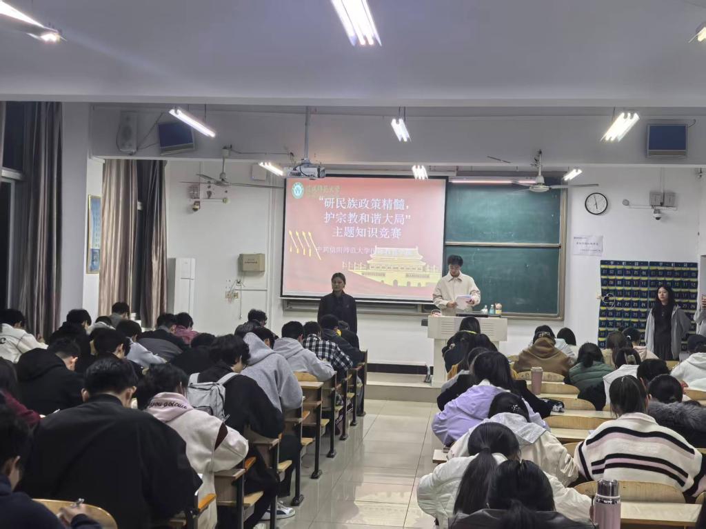 为深入学习贯彻习近平总书记关于民族宗教工作的重要论述,推动中国特色社会主义民族宗教理论入脑入心,提升师生对党的民族宗教政策和国家法律法规的理解与认同,11月2日晚,m88官网在俊采楼202教室举办“研民族政策精髓,护宗教和谐大局”主题知识竞赛。